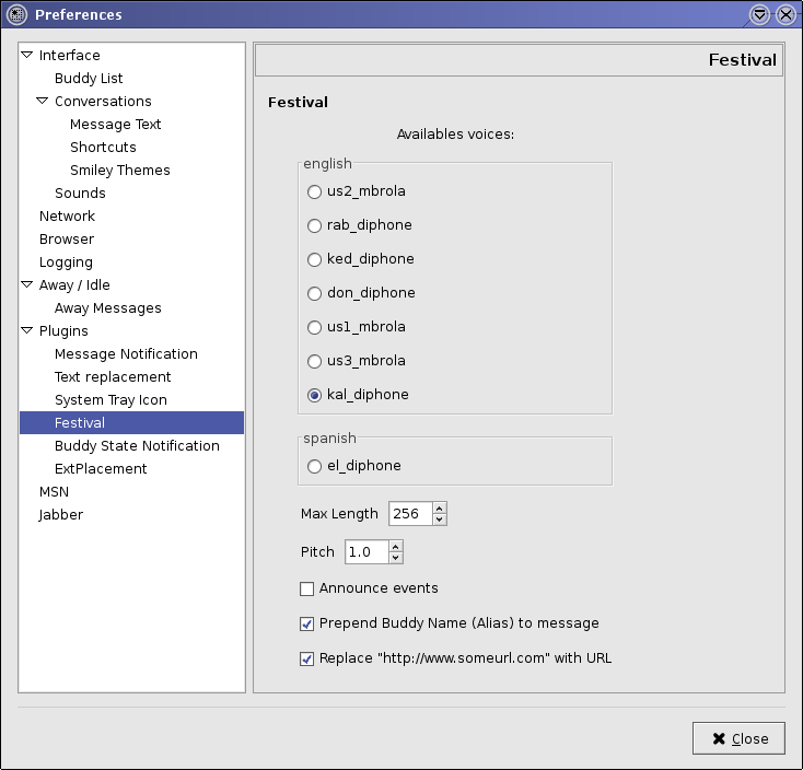 NOTE: I have lost my Mandrake system so I will not be making binaries anymore (rpm or else) so please do not email asking me about them. It is very easy to compile by source and install. If you need to contact me please do so at yahoo as that is my most checked email! Thanks y'all! - Rishi Current Version: 1.1 Festival-gaim is meant to be enhance your enjoyment of the popular Gaim program by interfacing w/ the popular speech program festival. It pipes the Instant Messages you receive into festival and voila you have your friends talking to you. As of now support is only for English, Spanish and Portuguese. If you wish to add translations of other languages please let me know. As of now you can download the rpms or source. The rpms are compiled on Mandrake 10 for Gaim 1.00. If you wish to use on other distro's try it, and let us know if it doesn't work.